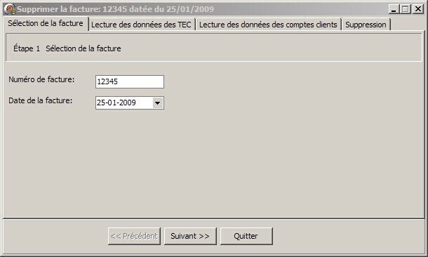 Après avoir indiqué l'information de la facture (étape1) et avant de procéder à l'étape 2, le logiciel va vérifier si des transactions de cette facture sont radiées (ultérieurement) ou font partie des transactions d'une autre facture. Si tel est le cas, un message sera affiché et la suppression de la facture sélectionnée sera impossible.