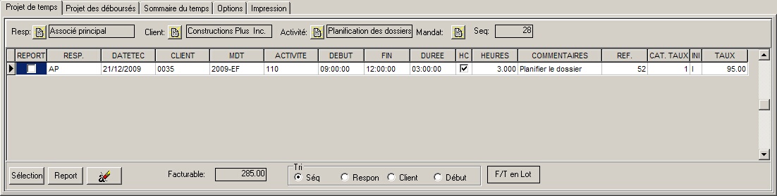 situé à gauche au bas de l'écran du fichier des projets de temps. Voir les notes concernant le Report des transactions.