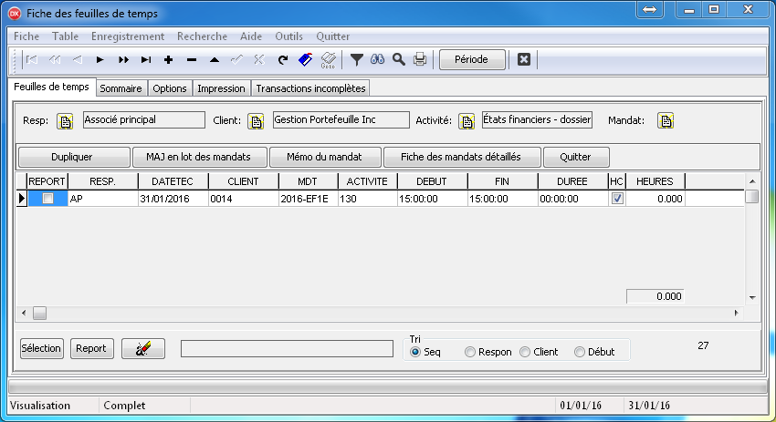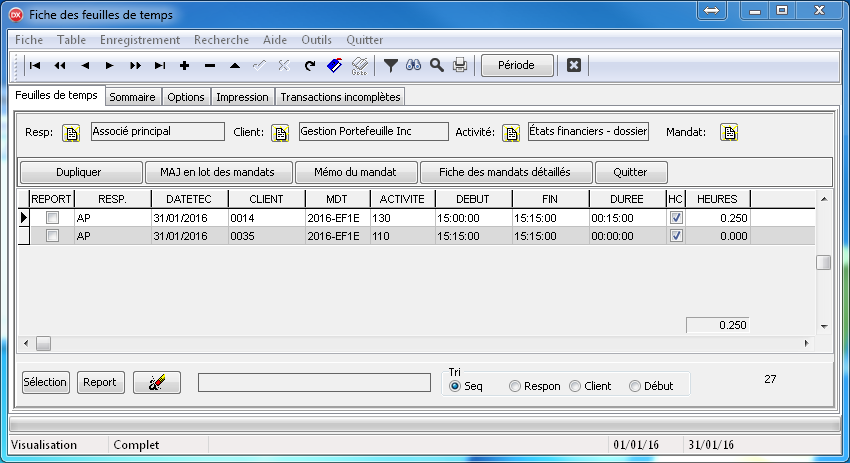 L'usager devra cocher la case Report, ou utiliser l'option de sélection des transactions, afin de compléter le tout. L'usager est ainsi en mesure de prendre connaissance des changements effectués par le logiciel au champ Durée et Heures avant de rendre cette transaction admissible au report.
